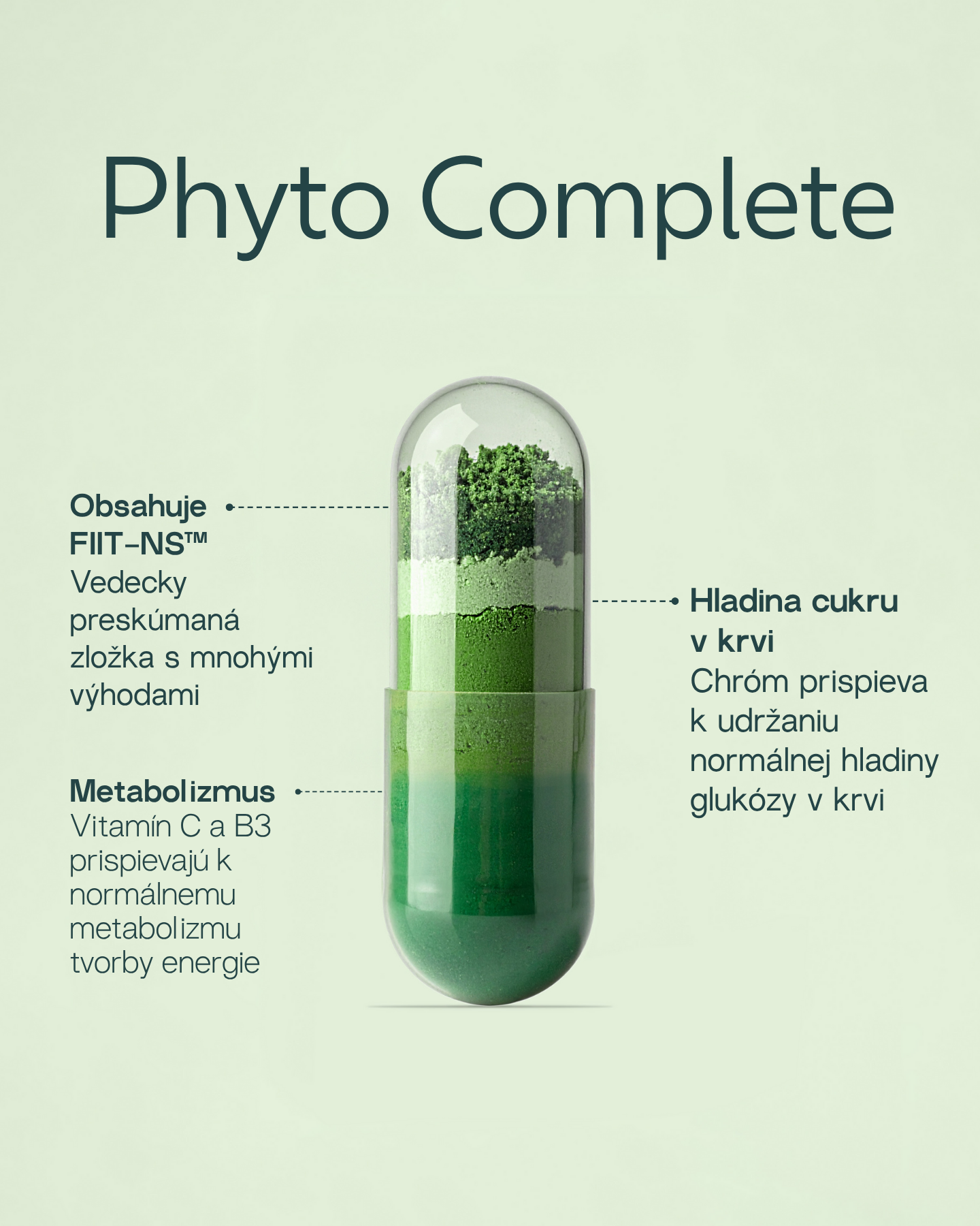 Po otvorení preneste kapsuly zo sáčku do dózy Phyto Complete. Tento sáčok slúži ako náhradné balenie.*Neprekračujte odporúčanú dennú dávku. Výživové doplnky sú určené na doplnenie stravy a nemali by sa používať ako náhrada pestrej stravy. Skladujte mimo dosahu malých detí. Neužívajte na prázdny žalúdok. Neužívajte, ak ste tehotná alebo dojčíte, a ak máte menej ako 18 rokov. Neužívajte, ak v ten istý deň konzumujete iné produkty obsahujúce zelený čaj. Neužívajte denné množstvo 800 mg (-)-epigallokatechínu-3-galátu (EGCG) alebo viac. EGCG v Phyto Complete: 90 mg (na 2 kapsuly).